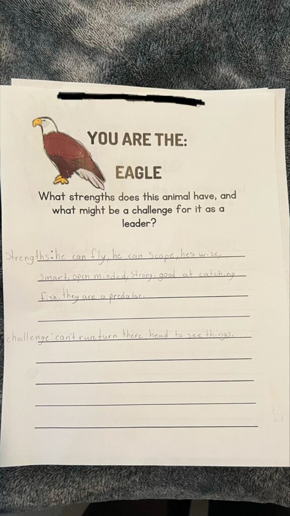 In our personal reflection activity, students reflected on the story and wrote about personal characteristics that would make them good leaders. After discussing leadership traits shown by the animals in The Animal People Choose a Leader, they identified qualities in themselves such as kindness, patience, fairness, listening, responsibility, or creativity, using a Canva prompting sheet. Sentence starters like âI am interested inâŠâ and âI likeâŠâ helped students who needed support beginning their writing, reducing anxiety and helping them focus on expressing their ideas. One student was adapted for by sharing verbally while we recorded their responses on paper. Next time, we might allow more time for a think-pair-share before writing so students can discuss ideas with a partner and feel more confident in their reflections. This lesson connects to the Professional Standards for BC Educators, specifically âEducators understand and apply knowledge of student growth and development,â as activities were scaffolded to match studentsâ developmental levels and allowed all learners to participate meaningfully. Students also completed a cut-and-paste activity matching student-friendly versions of the First Peoples Principles of Learning (FPPLs) to examples from the story, identifying moments such as animals showing leadership, patience, or teamwork. Simplifying the FPPLs allowed all students, including those who struggle with complex text, to engage fully and make connections between the story and cultural values. Next time, we would provide more examples or story connections, as students were highly engaged and completed the activity quickly. This lesson also supports âEducators respect and value the history of First Nations, Inuit, and MĂ©tis in CanadaâŠâ because students explored the story and connected it to FPPLs, seeing how these teachings from the past still influence how we think about leadership and working together today.